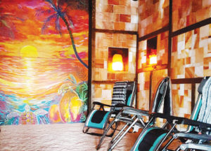TB: All of my salt originates in Pakistan in the Himalayan mountains. It was all hand-cut and laid in place by myself in a mosaic pattern. The floor is covered in food-grade salt also, to massage your feet as you enter. It is reflexology, and stimulates certain organs in the body. This is in addition to our zero-gravity NASA-inspired chairs to give you relief of the spine and hips, by taking away the gravity, and allowing the disc to hydrate. It is also anti-inflammatory, which reduces swelling in the body. While doing countless hours of research I would often see references to Cleopatra being in salt chambers, as she thought it made her beautiful and healthy. I had her painted on my wall as a reminder how long this therapy has been around.